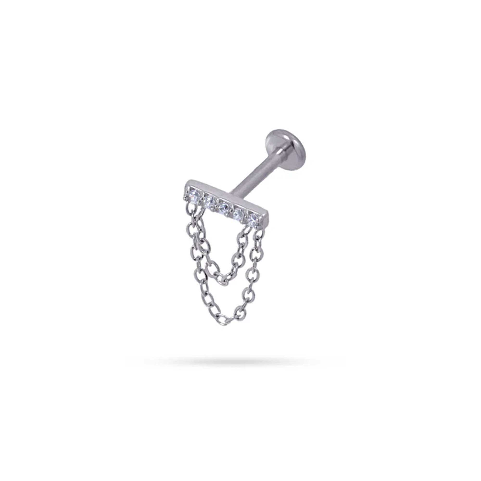 Piercing con forma de barra con circonitas y cadenas. Cierre de chapa. Muy cómodo.
