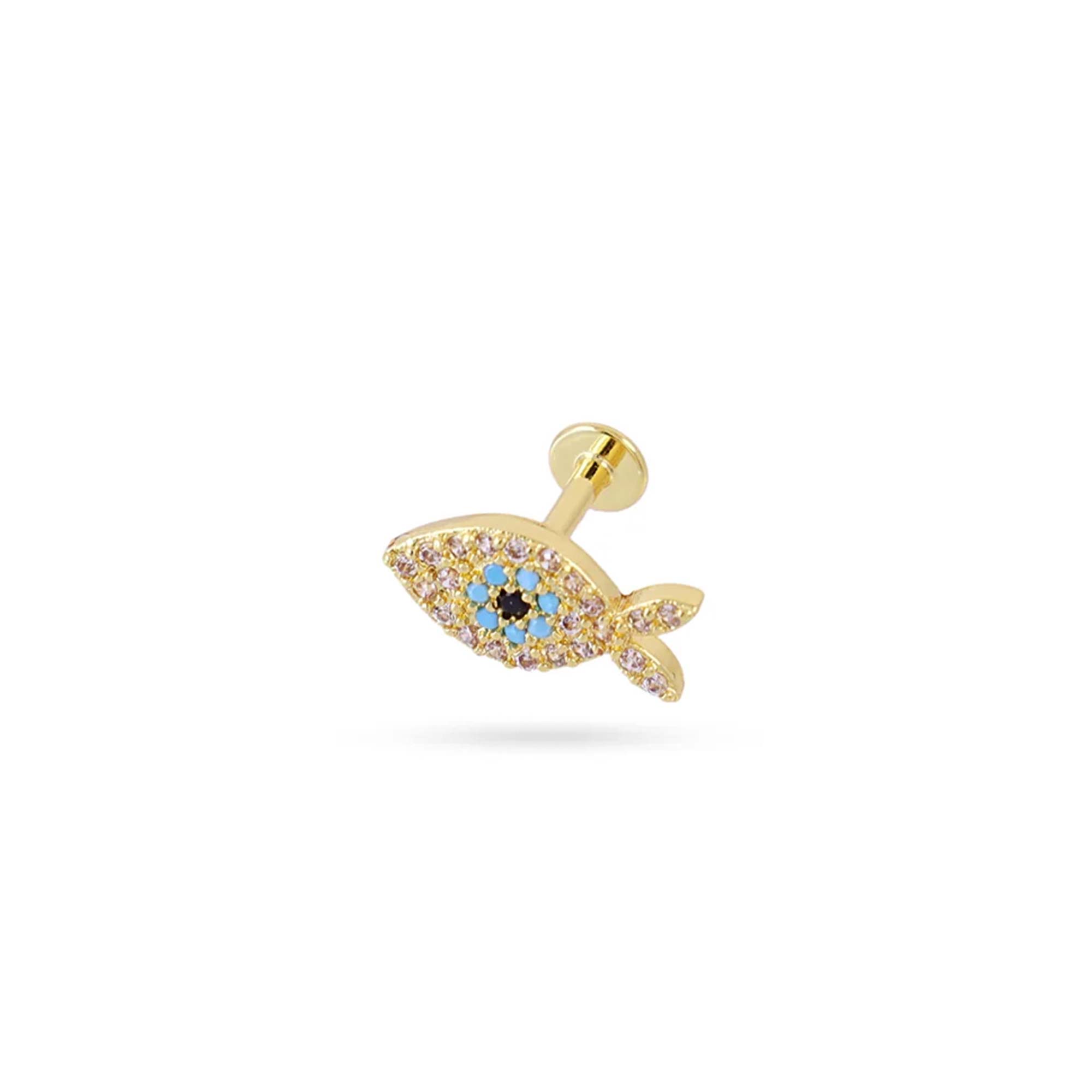 Un mini piercing cargado de simbolismo y estilo. El diseño con forma de pez está cubierto por un brillante pavé, y presenta un ojo central en tonos turquesa y negro, actuando como un amuleto protector. Su tamaño es ideal para el tragus, hélix o el lóbulo superior, combinando moda marina con misticismo.