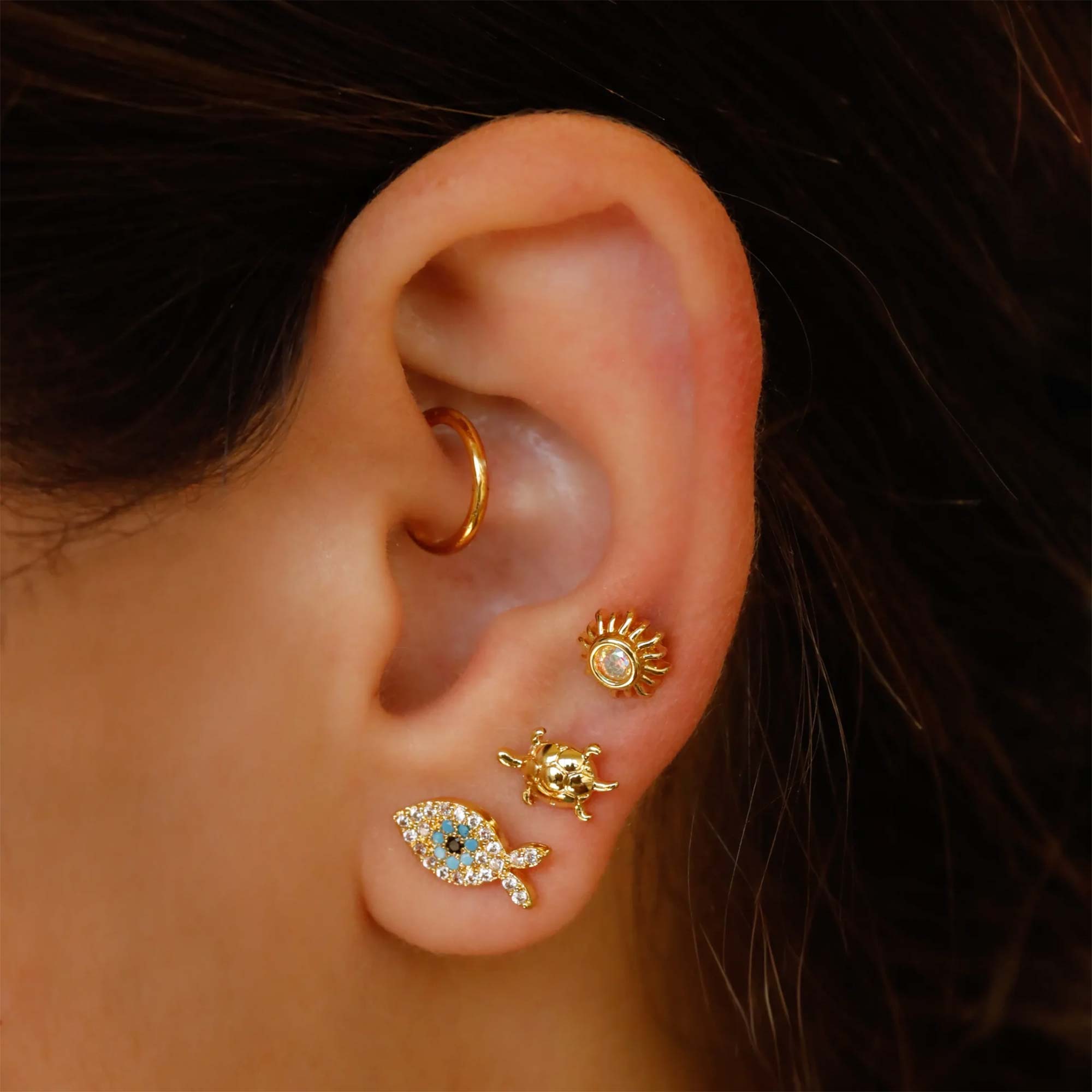 Piercing compuesto por un adorno frontal con forma de sol, con un disco central rodeado de rayos texturizados. En el centro de este diseño hay una circonita redonda.