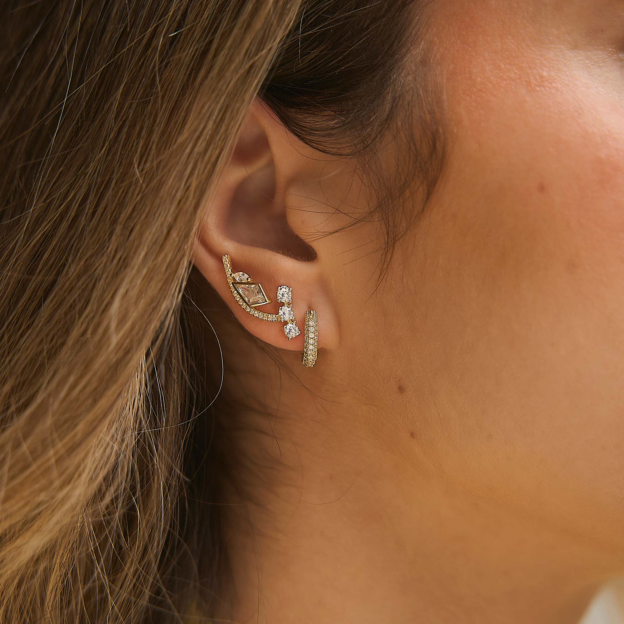 Este pendiente de botón presenta una silueta curva adornada con una hilera de circonitas brillantes, resaltada por una gema central en talla rombo que aporta un estilo geométrico y moderno.