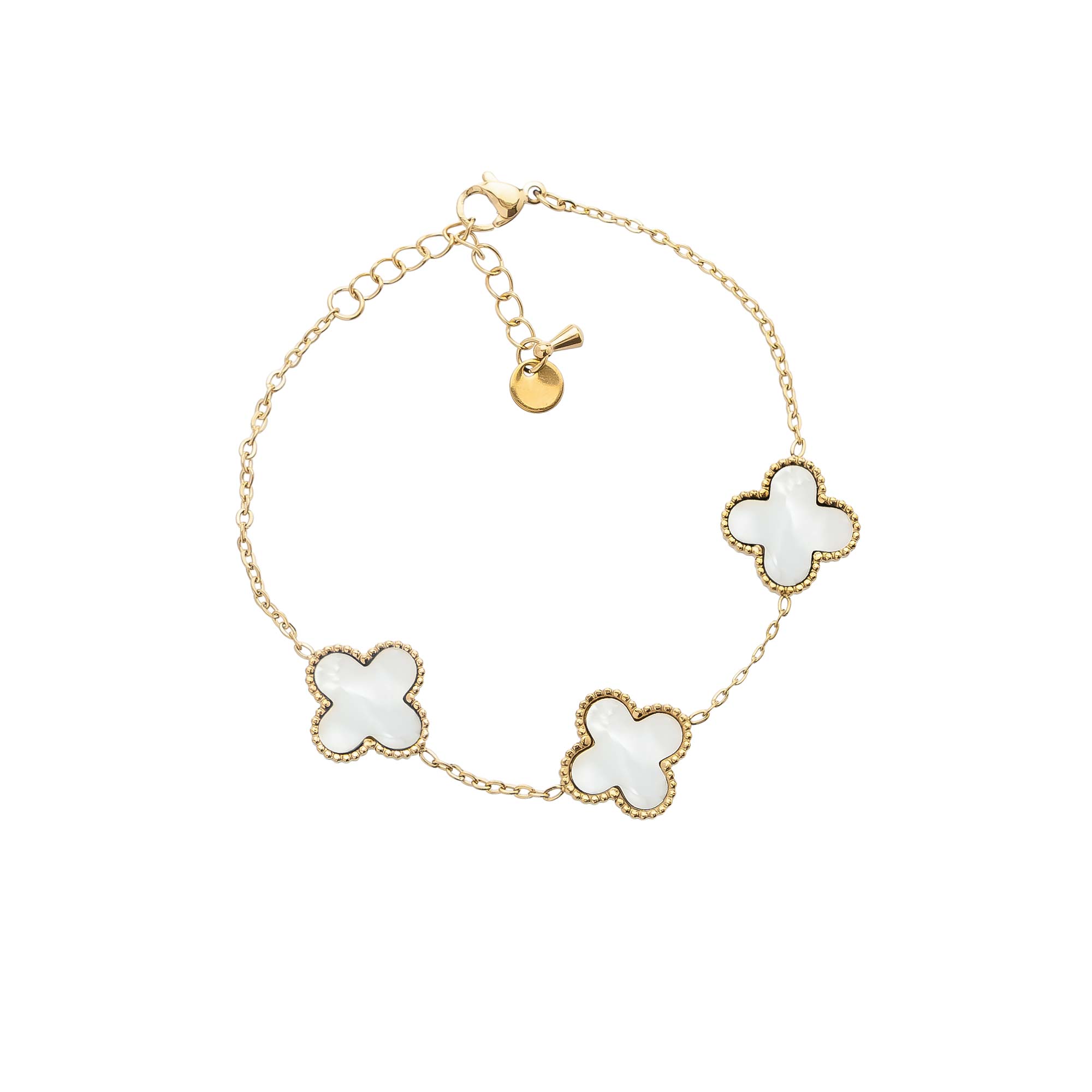 Add to WishlistElegante pulsera de cadena fina, adornada con tres motivos en forma de trébol de cuatro hojas, cada uno con un centro de nácar blanco iridiscente y un borde perlado. Cuenta con un cierre de langosta ajustable y un pequeño colgante redondo. Un accesorio clásico y sofisticado, perfecto para añadir un toque de suerte y delicadeza a tu muñeca.