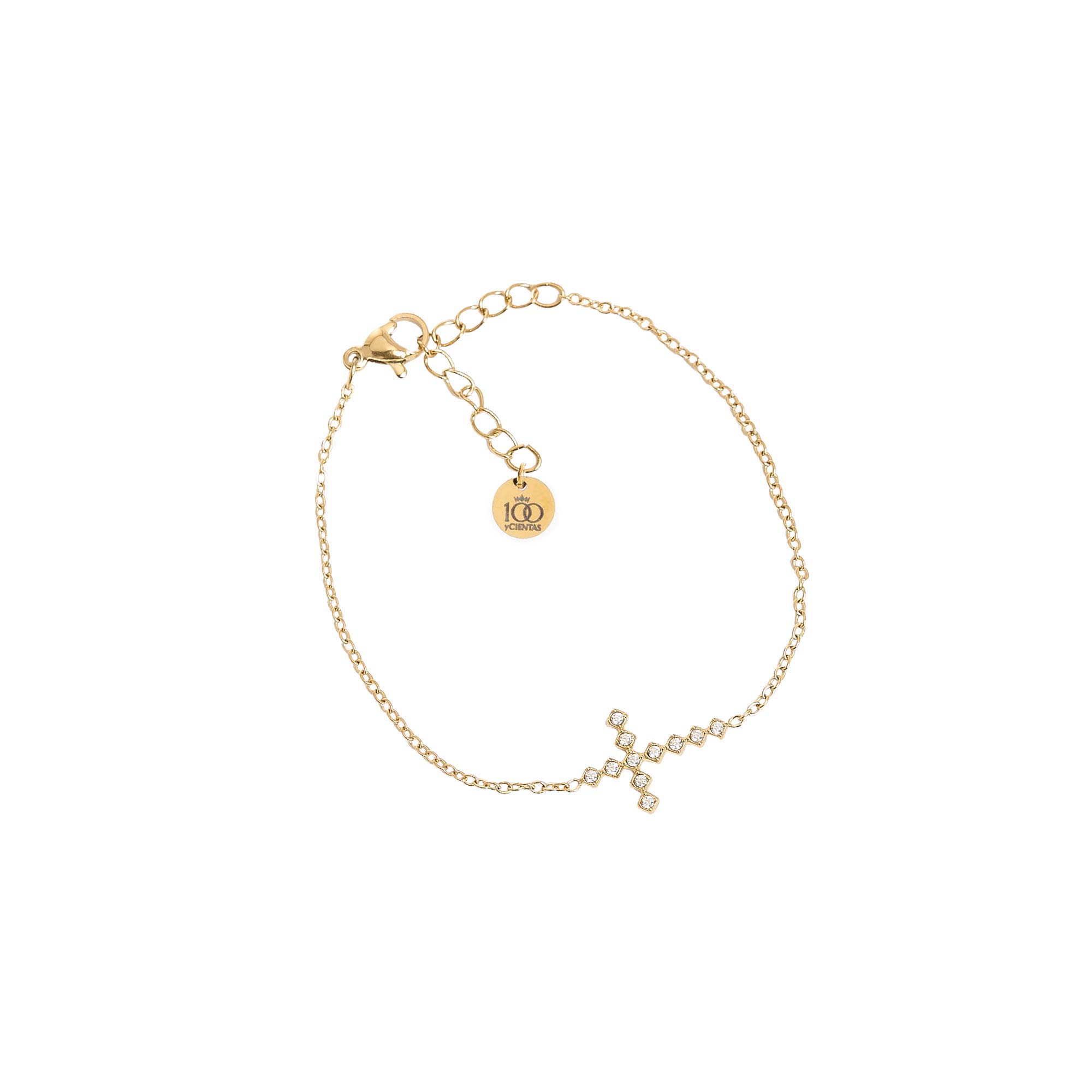 Pulsera con una cruz formada circonitas y acabada en dorado.