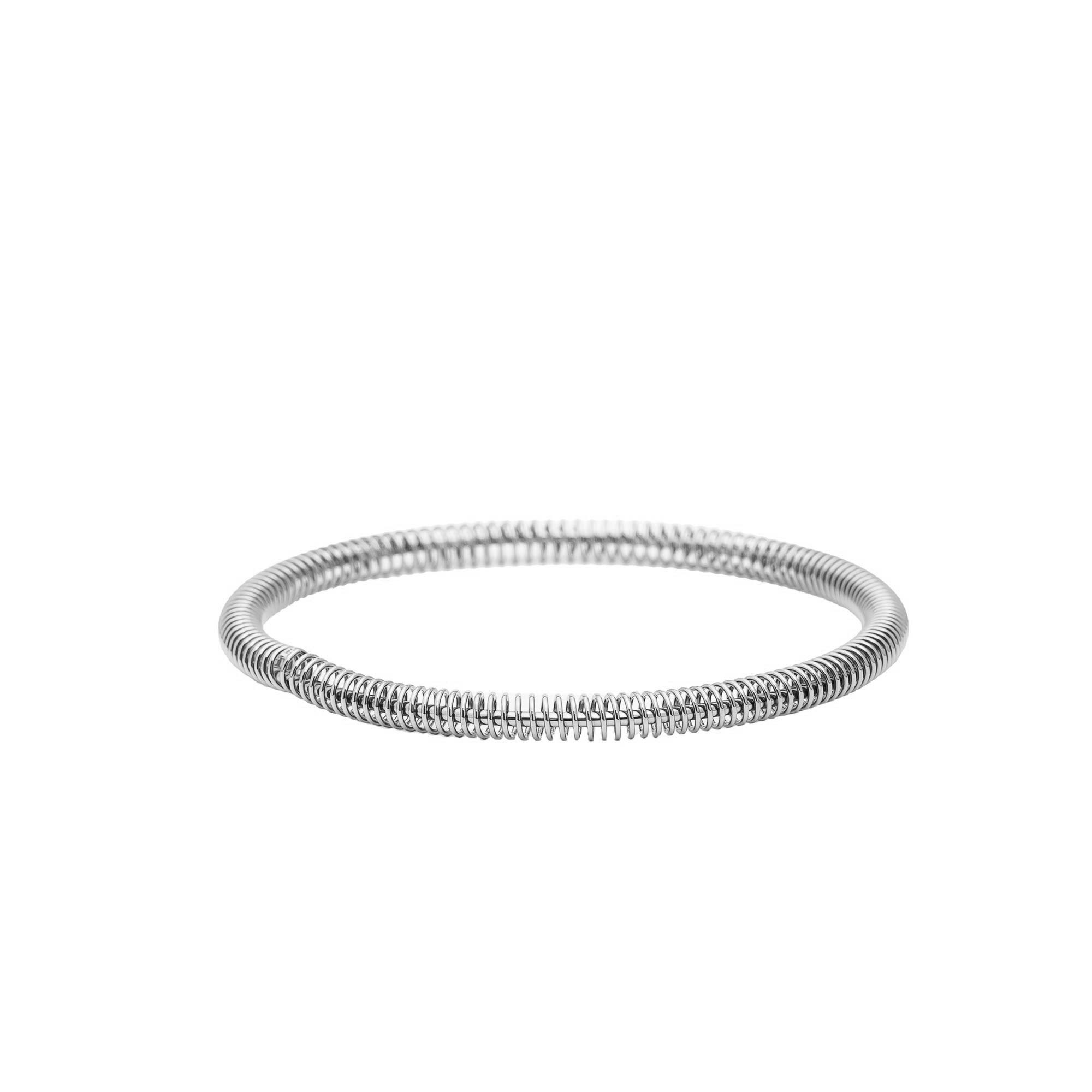 Pulsera con forma de muelle y con acabado de acero plateado. Cierre de clic lateral.
