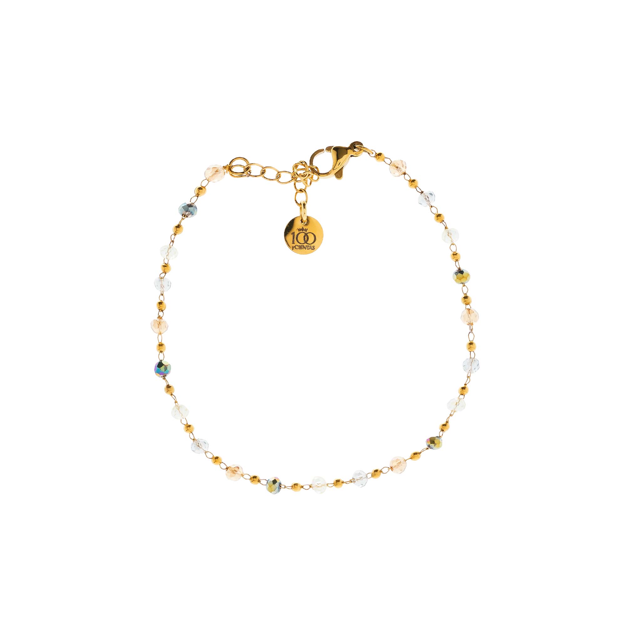 Add to WishlistEncantadora pulsera elaborada con una mezcla de pequeñas cuentas facetadas transparentes, perlas en tono crema y cuentas iridiscentes, intercaladas con diminutos abalorios redondos brillantes. Cuenta con un cierre de langosta ajustable y un pequeño colgante redondo grabado. Ideal para añadir un toque de luz y sofisticación a cualquier atuendo.