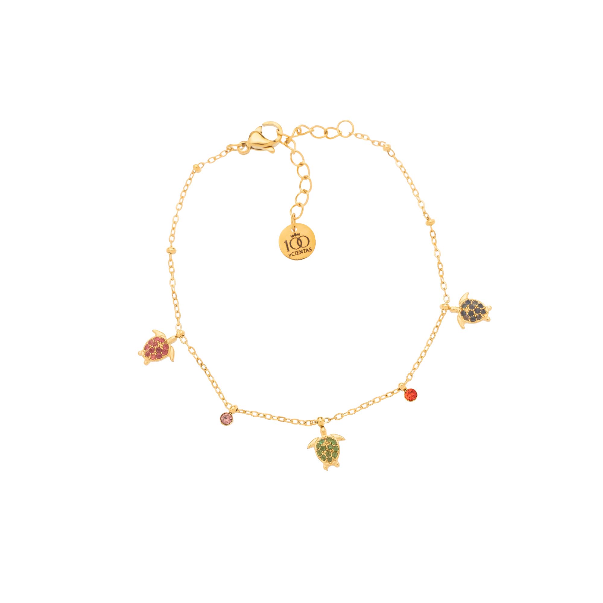 Preciosa pulsera con tres charms de tortugas con circonitas de colores.