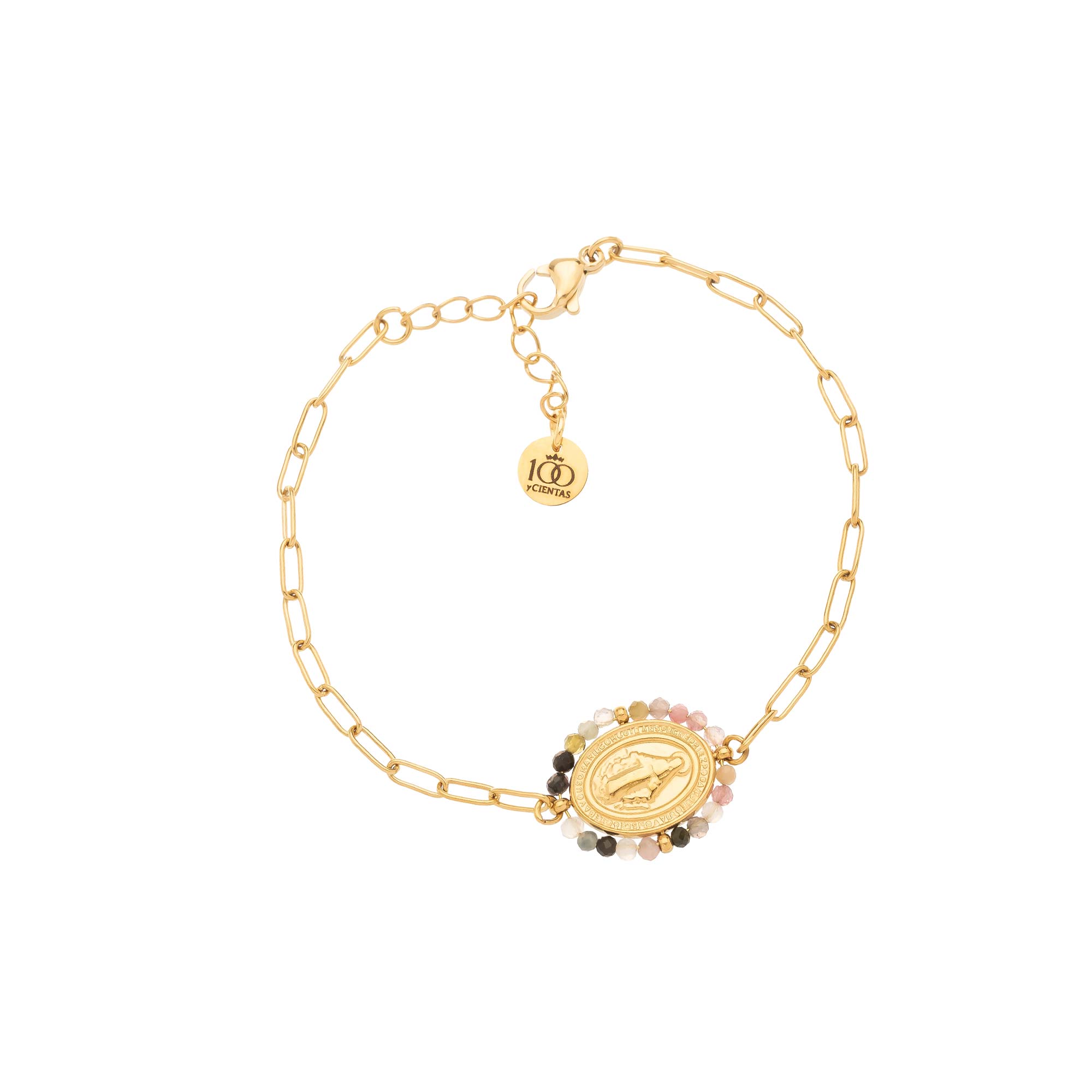 Add to WishlistPulsera de eslabones con medalla central de la Virgen, rodeada de pequeñas cuentas decorativas.