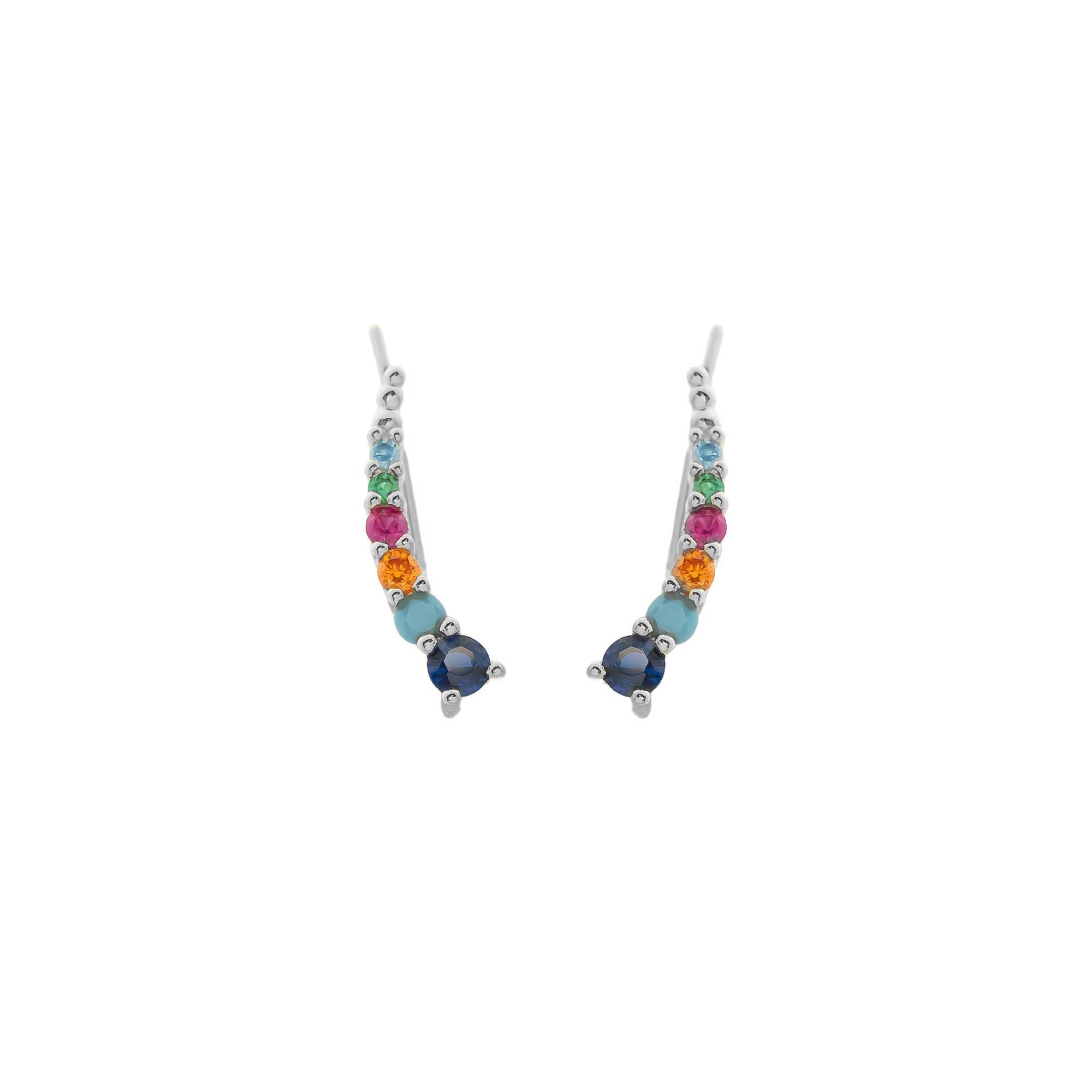 Add to WishlistPendientes curvos, diseñados para subir por el borde de la oreja. Están adornados con una hilera de gemas redondas de diferentes colores, incluyendo una gema azul oscuro en el extremo inferior, y otras en tonos turquesa, naranja, verde y rojo.