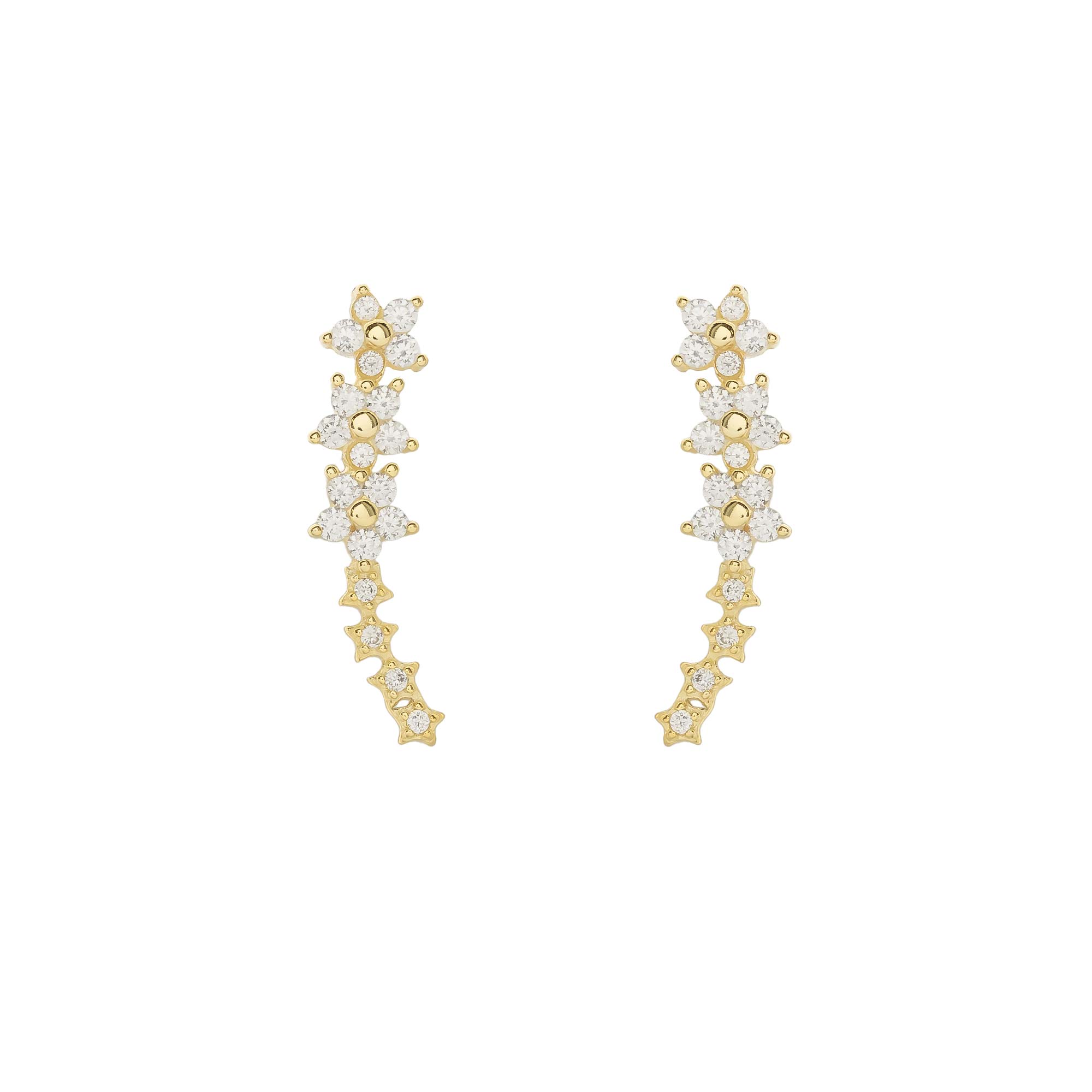 Add to WishlistPendientes largos y curvados, diseñados para subir por el borde de la oreja. Están formados por una sucesión de motivos florales y estelares. La parte superior consiste en dos diseños de flor, cada uno compuesto por seis circonitas que rodean una circonita central. La parte inferior se extiende con una hilera de pequeñas formas de estrella, también adornadas con circonitas.