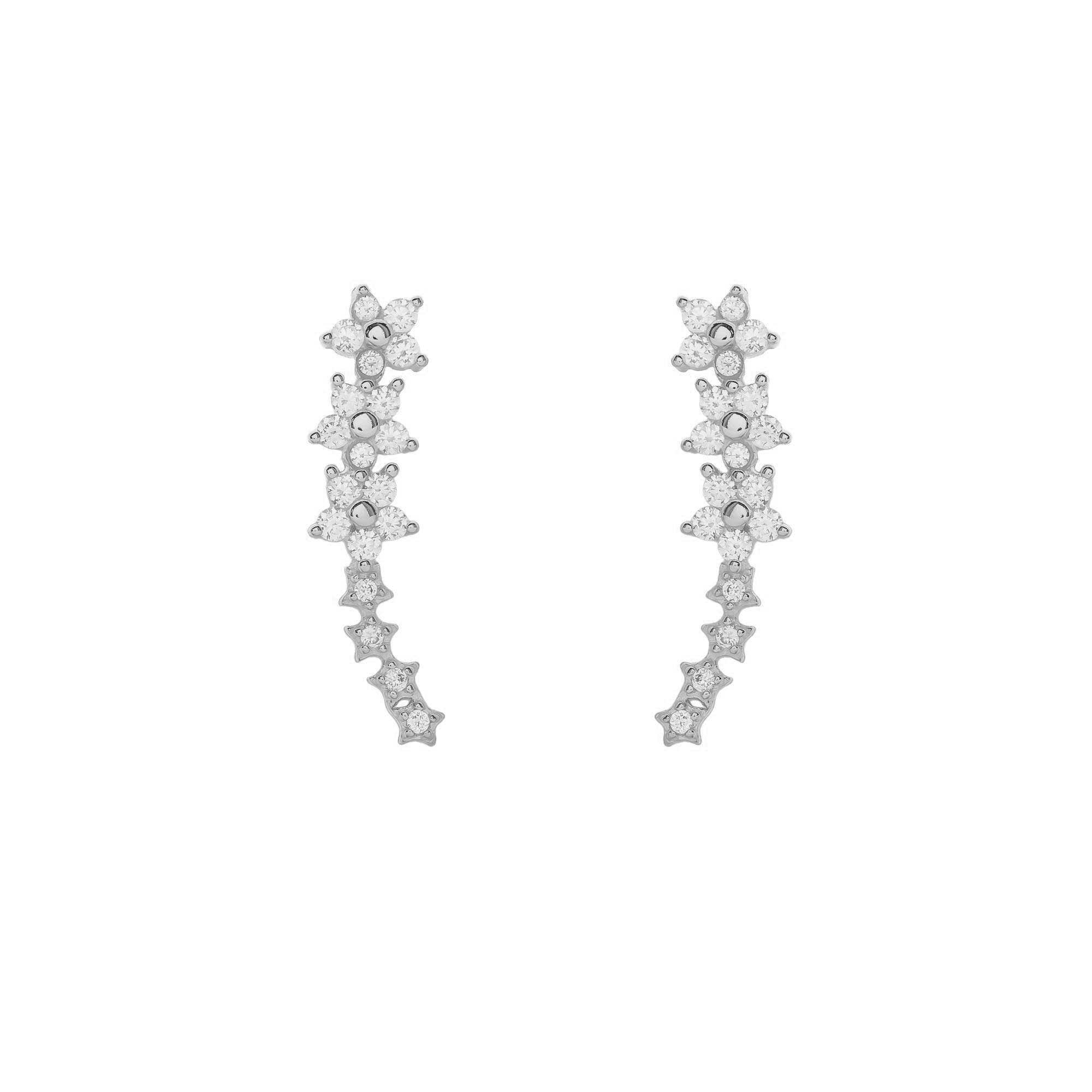 Add to WishlistPendientes largos y curvados, diseñados para subir por el borde de la oreja. Están formados por una sucesión de motivos florales y estelares. La parte superior consiste en dos diseños de flor, cada uno compuesto por seis circonitas que rodean una circonita central. La parte inferior se extiende con una hilera de pequeñas formas de estrella, también adornadas con circonitas.