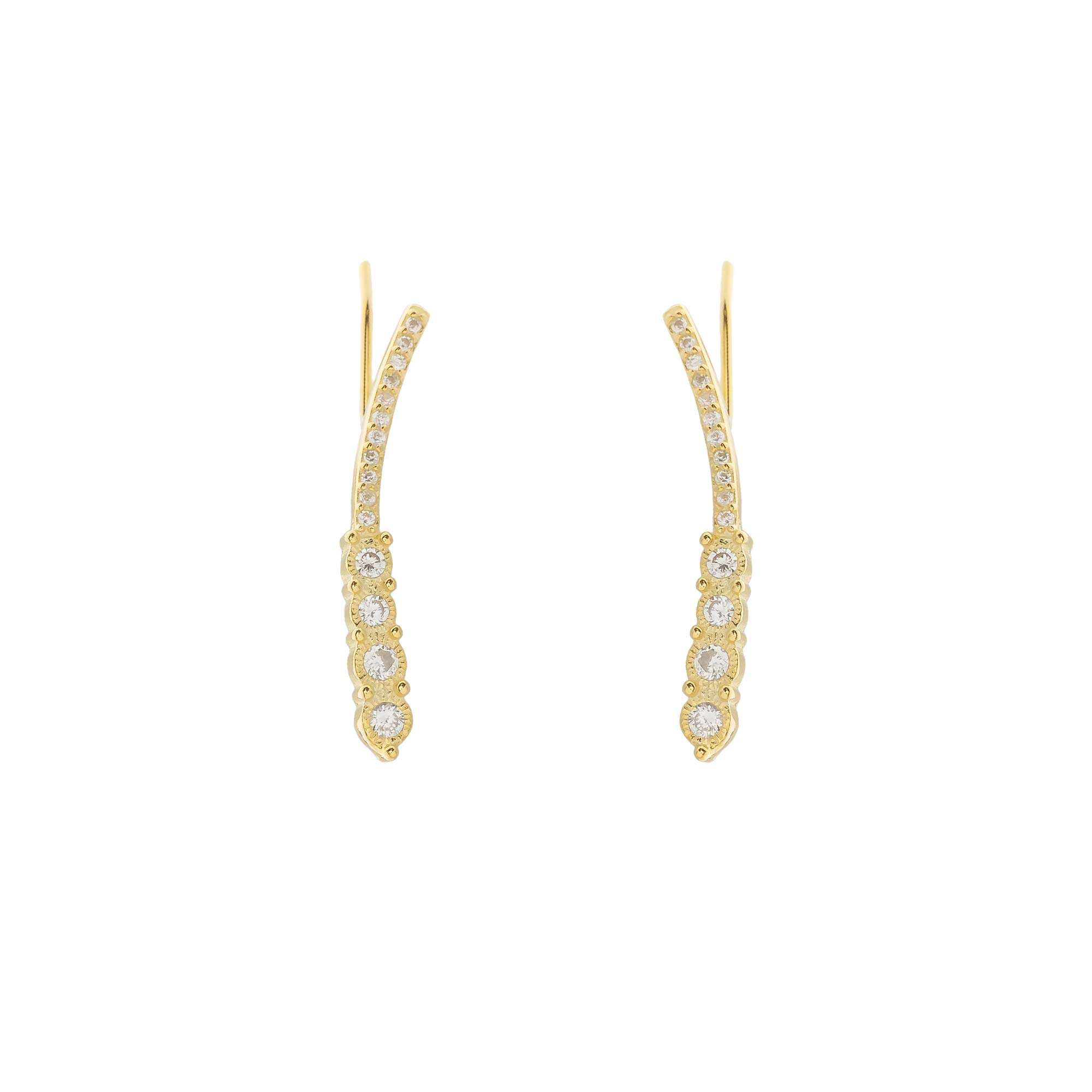 Add to WishlistPendientes largos y curvados, diseñados para subir por el borde del lóbulo. Están adornados con una fila de cuatro circonitas redondas en la parte inferior, y una segunda fila de circonitas más pequeñas que recorre el borde superior de la curva.